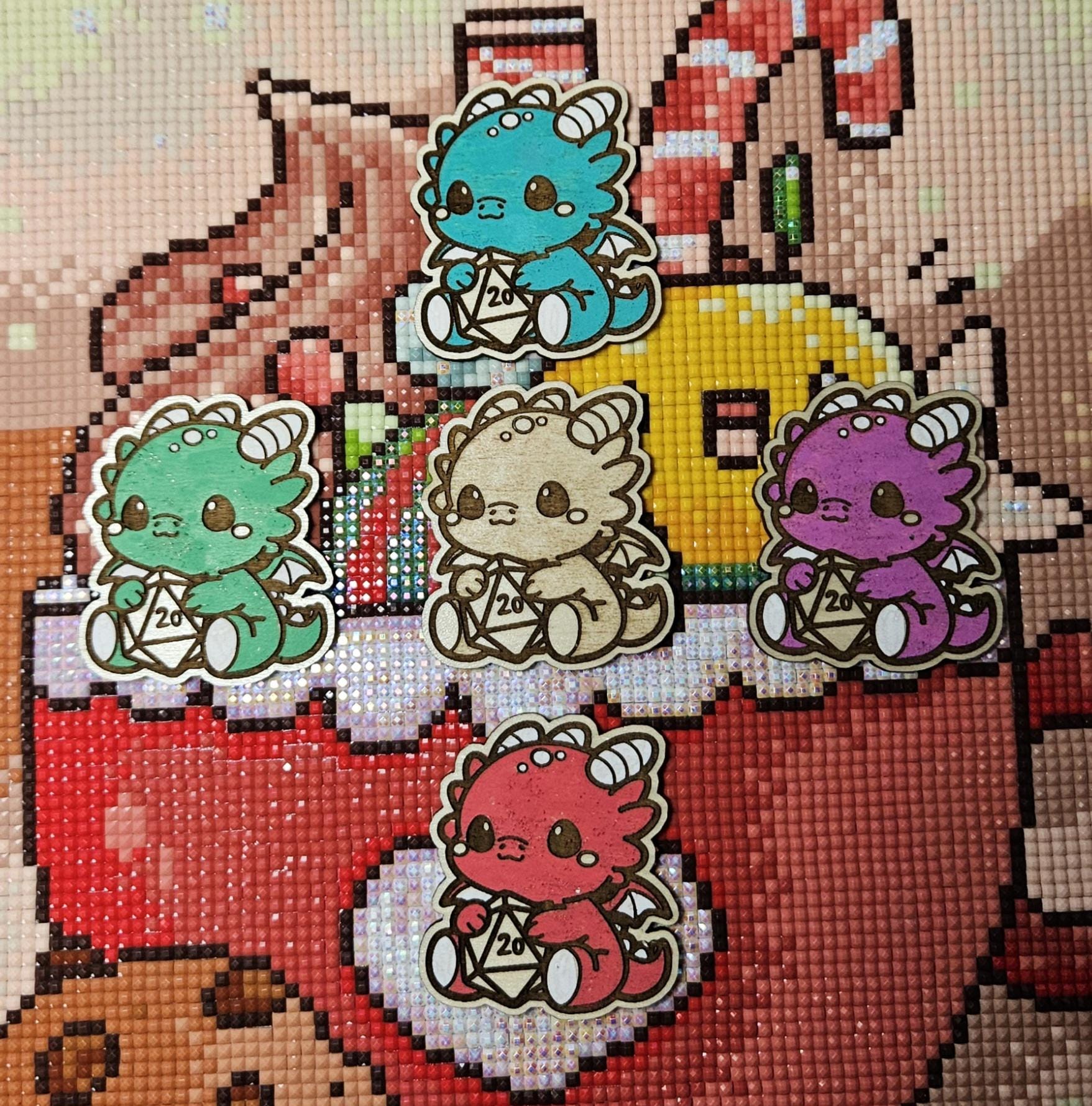A tiny baby dragon holding a D20 to keep your crafting session organized!