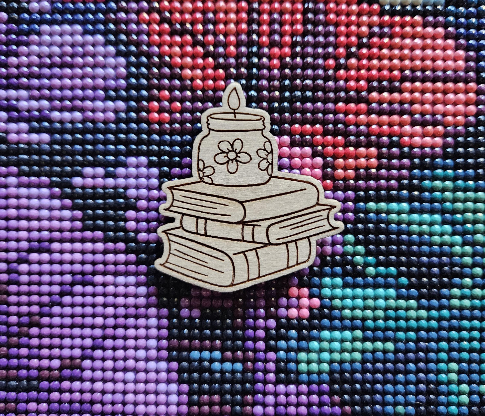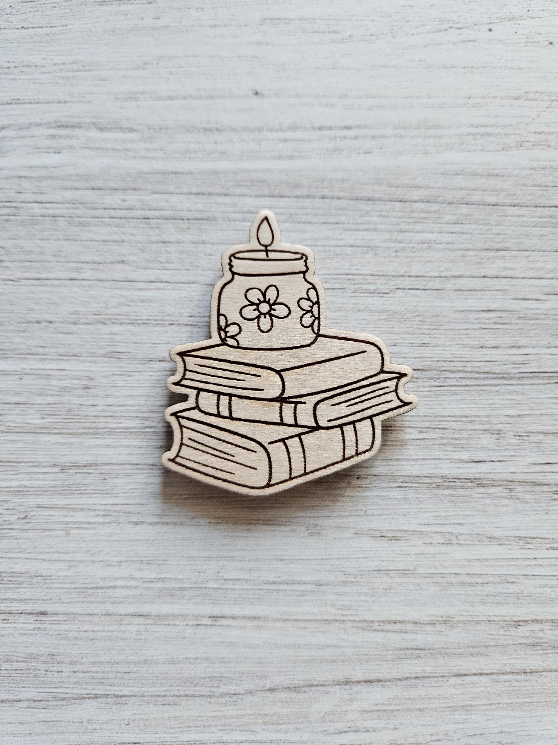 A small flame, atop a stack of books, keeping you company while you craft