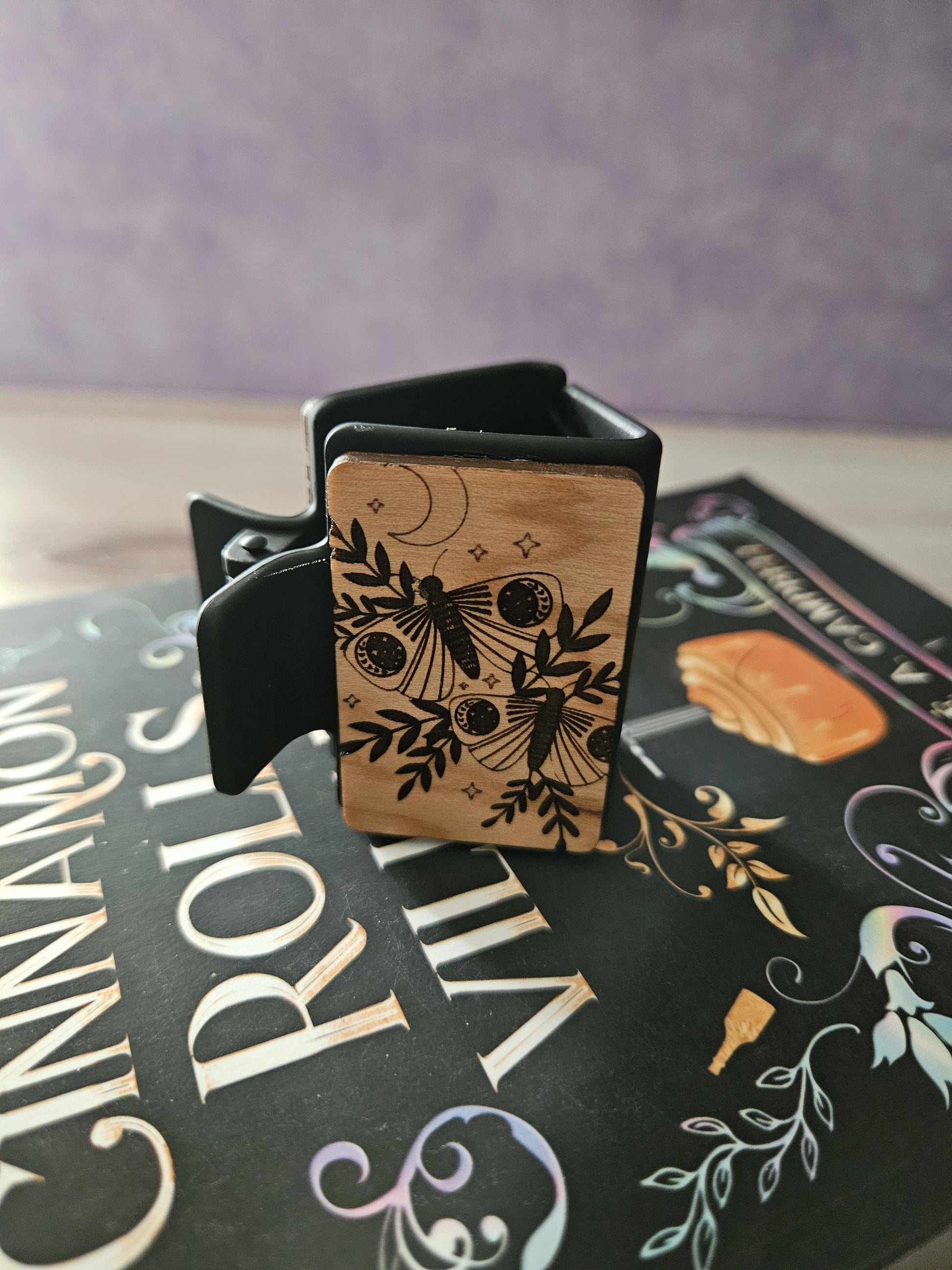 This item is engraved and cut using a laser, and then hand finished and adhered to a 2" matte black hair claw clip.