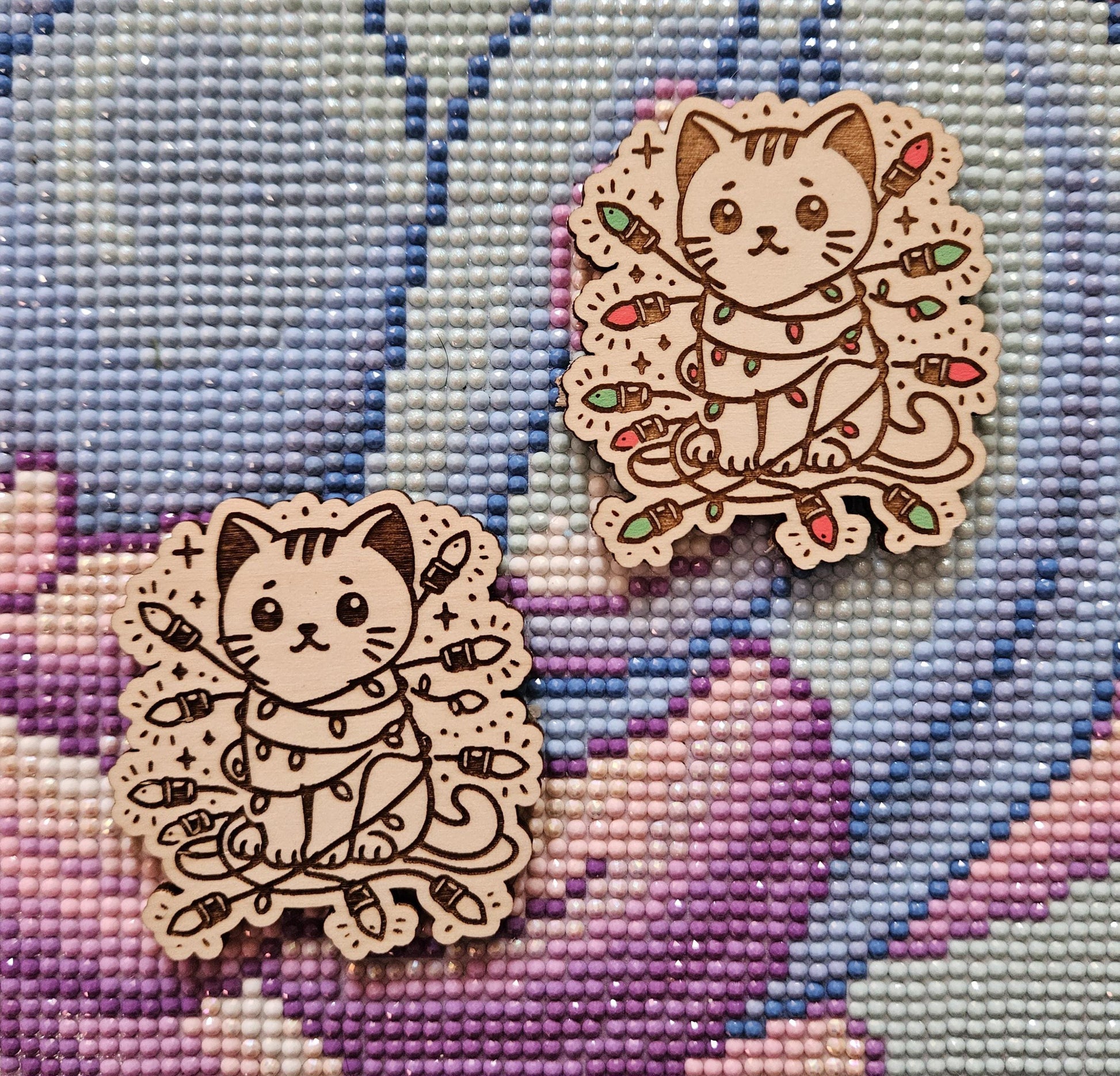 Like yarn, cats cannot leave Christmas lights well enough alone. This adorable, naughty cat can keep your needle in place, and your cover out of your way.