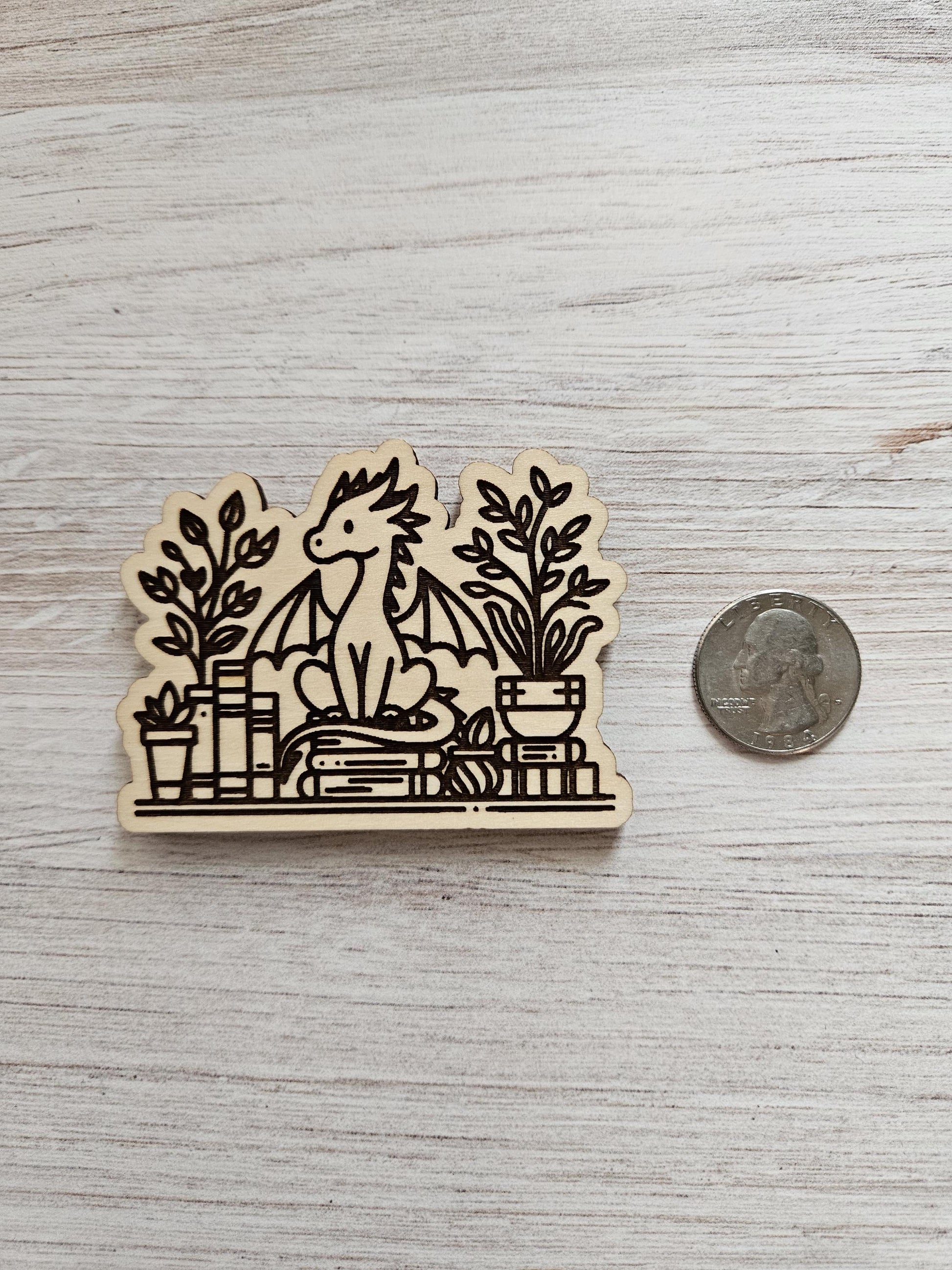 Featuring a cute dragon sitting on top of a pile of books surrounded by potted plants.