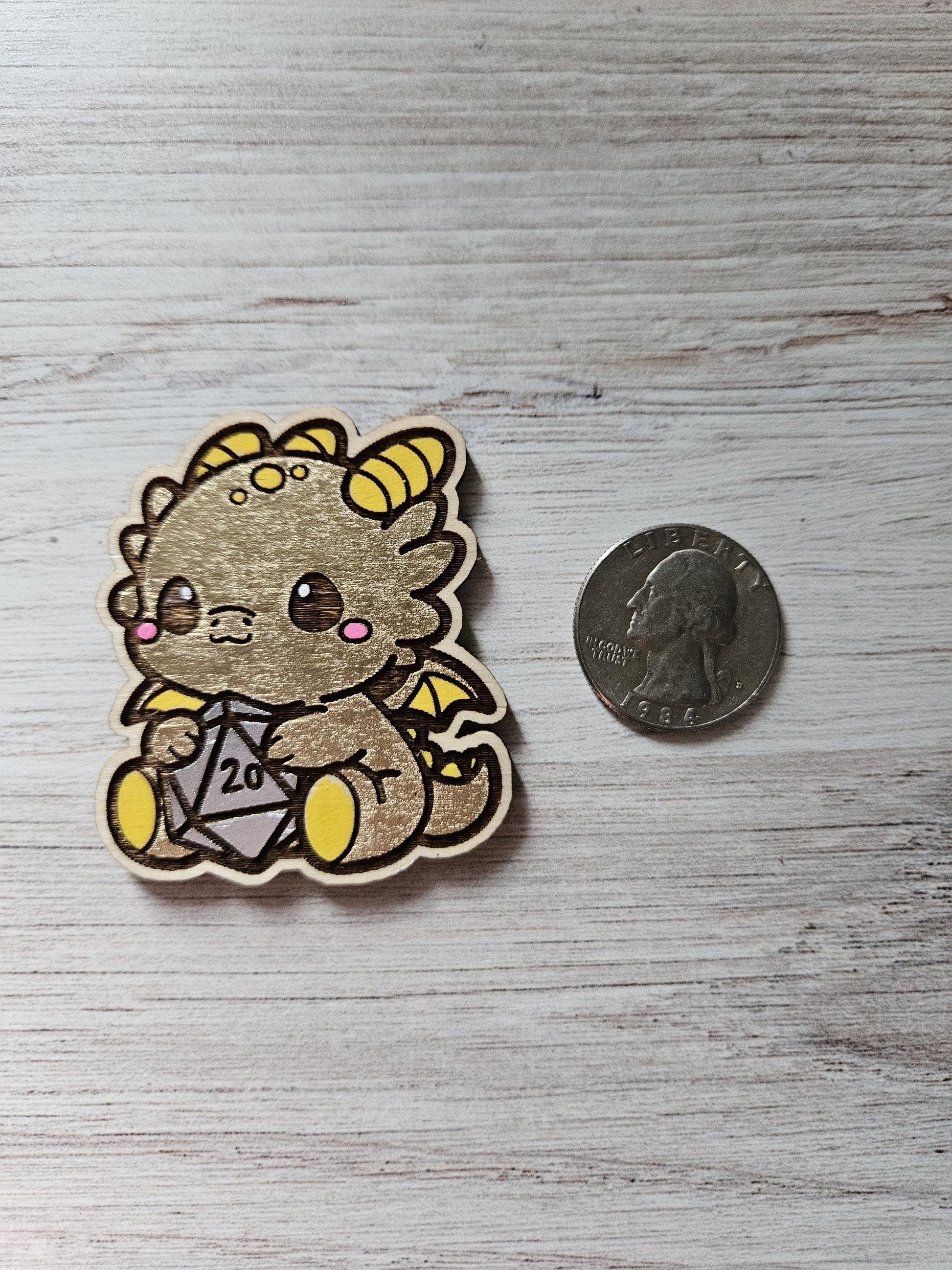 Featuring a baby dice dragon painted using gold acrylic paint to make her shimmer like Andarna does in Fourth Wing, with her own little silver dice as a nod to her favorite rider.