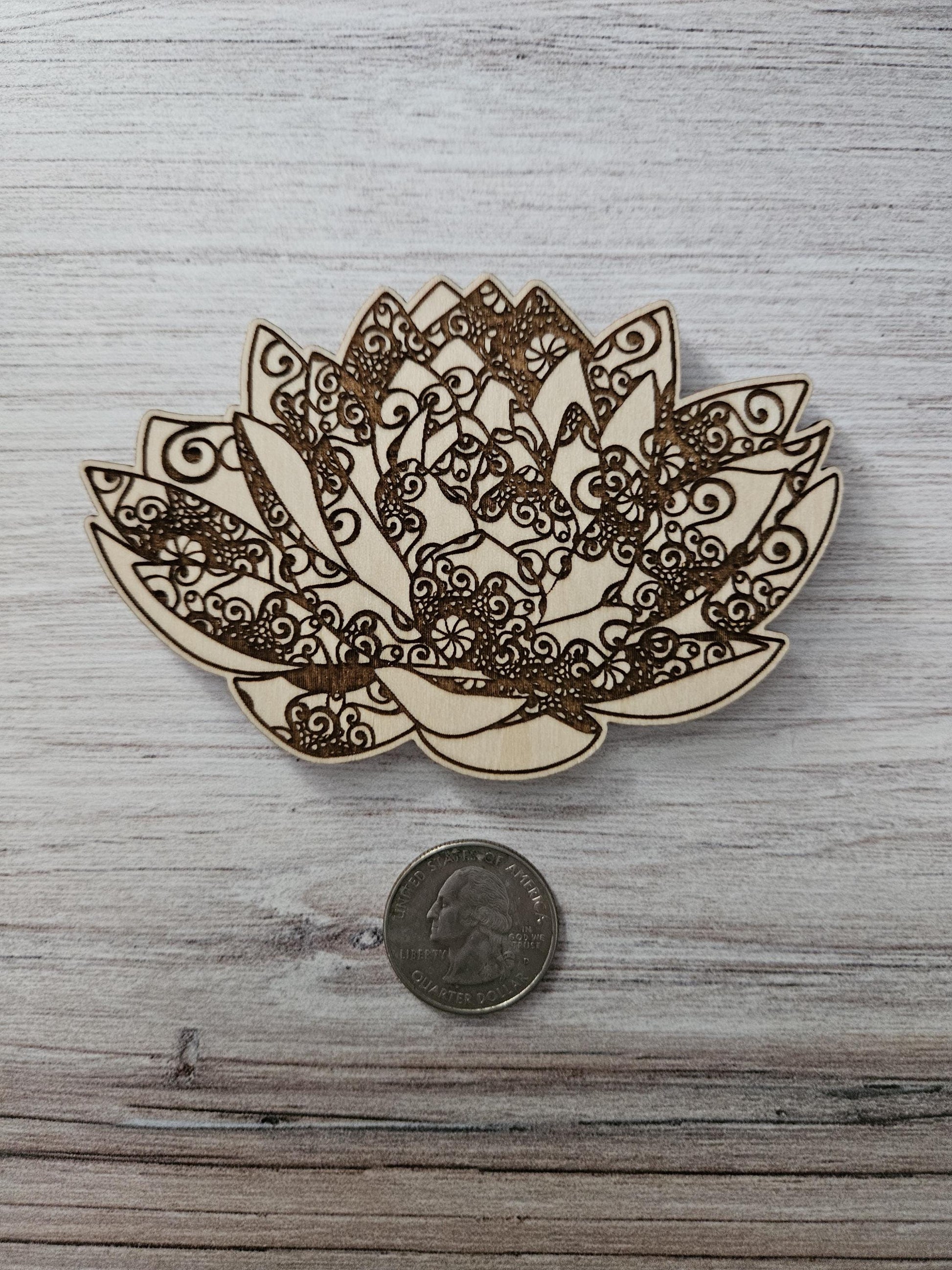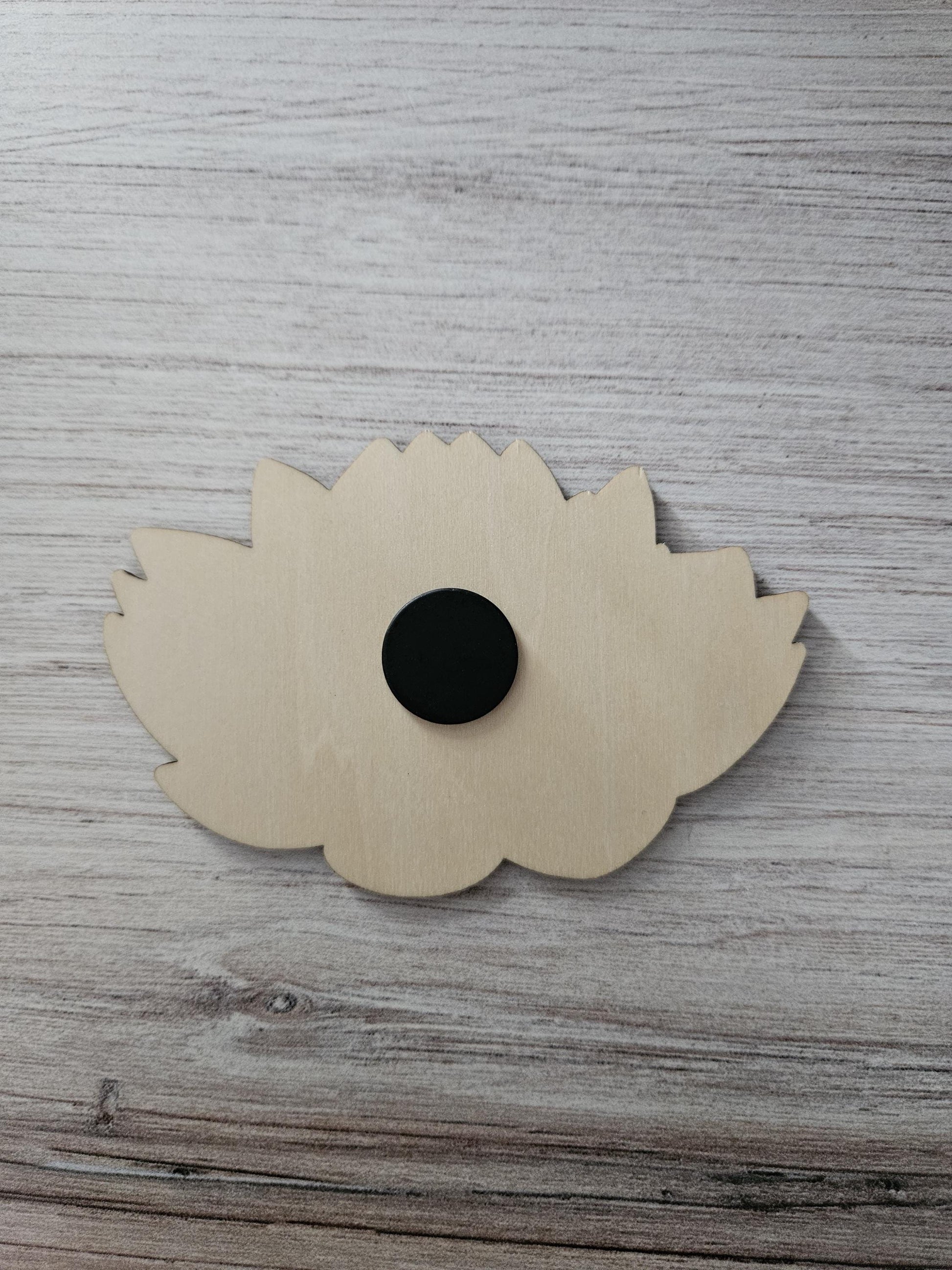 This magnet is engraved and cut using a laser cutter. It is then finished by hand, with a black magnet adhered to the back.