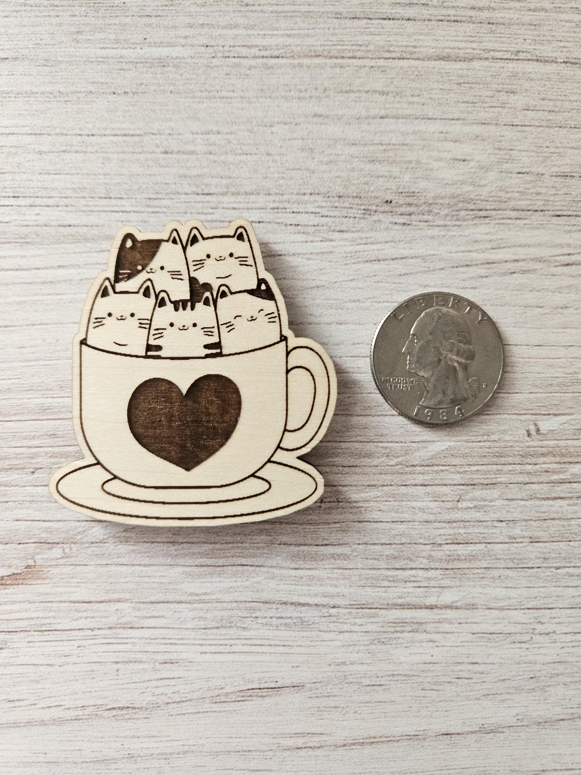 Featuring 5 cats peeking out of a large mug with a heart on the front to smile at you.