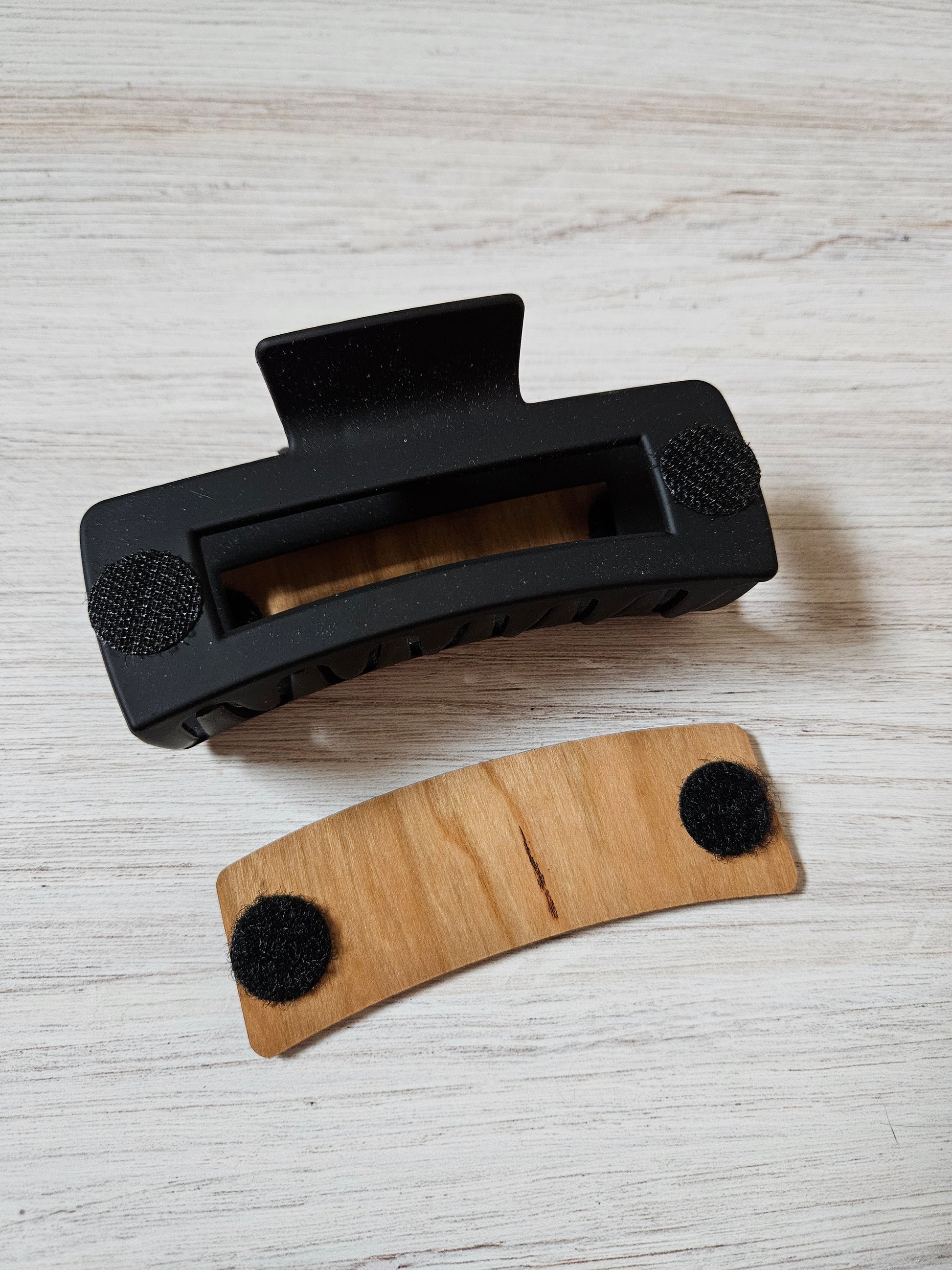 This item is engraved and cut using a laser, and then hand finished and adhered to a 2" matte black hair claw clip.