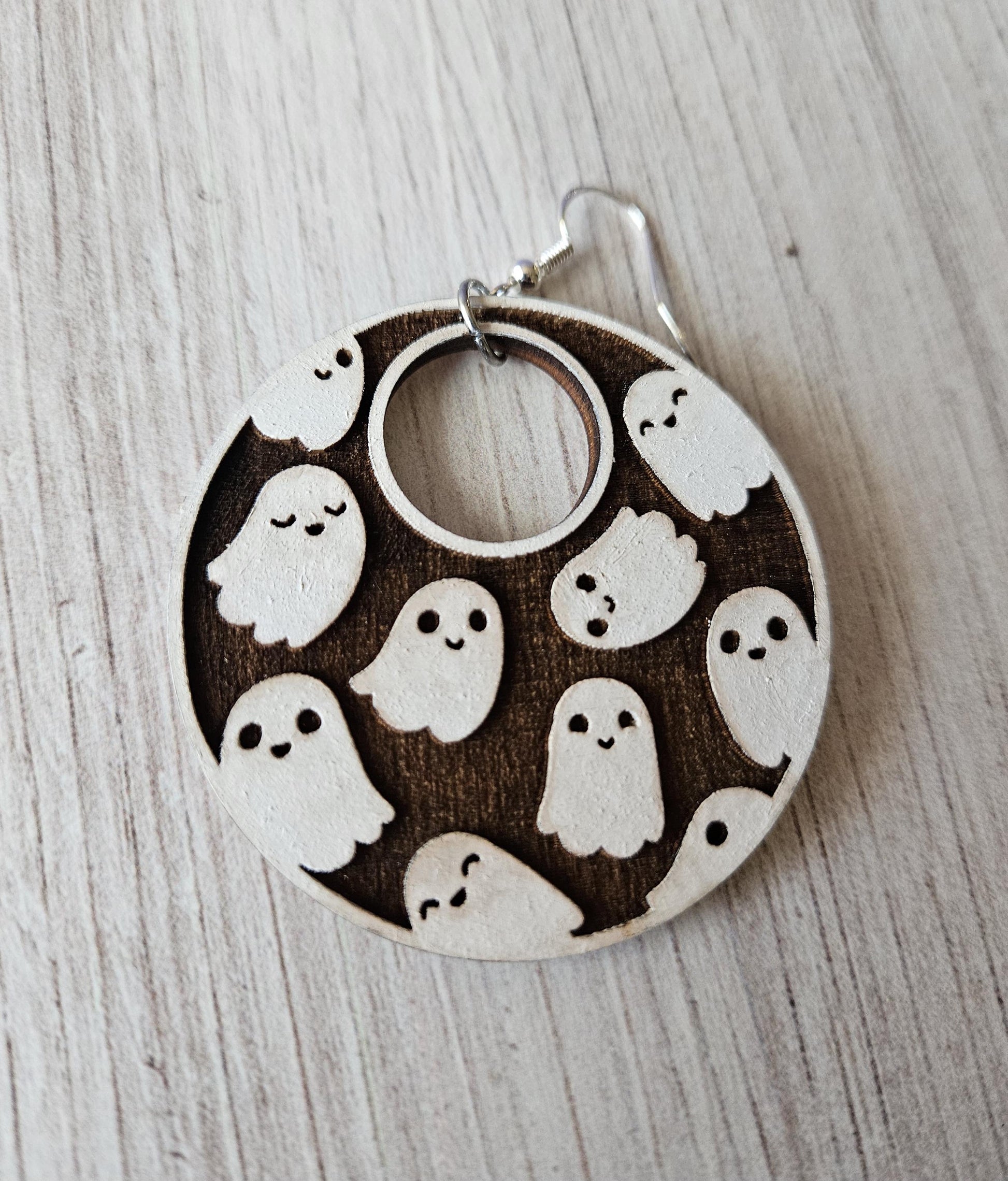 These earrings feature a large wooden circle with multiple smiling ghosts floating around, a fantastic accessory for any spooky season outfit; even when spooky season is all year long.